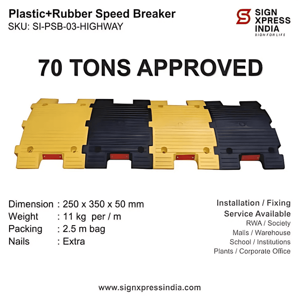 Signxpress India Speed bumps (or speed breakers) are the common name for a family of traffic calming devices that use vertical deflection to slow motor-vehicle traffic in order to improve safety conditions. Variations include the speed hump, speed cushion, and speed table. The use of vertical deflection devices is widespread around the world, and they are most commonly found to enforce a low-speed limit, under 10 km/h or lower. Signxpress India Speed bumps are abrupt raised areas, typically 2–3 inches high with a travel length of 12 inches, that can be comfortably crossed at speeds of 5 miles per hour or less. Crossing at higher speeds can cause significant discomfort for the vehicle’s occupants. Because Signxpress India Speed bumps require an immediate and dramatic slowdown, they are often considered to be a liability risk on public streets and other roads where higher speeds are allowed. If you need a speed control solution for low-speed areas, such as parking lots, garages, and low-traffic private roads, Signxpress India Speed bumps would be a good option. Signxpress India Speed humps are designed to slow vehicles while maintaining traffic flow, with a gentler rise and a lower peak height. Their design allows drivers to cross comfortably without sudden braking, allowing traffic to flow smoothly while still controlling speed. Signxpress India Speed humps are ideal for entertainment venues that accommodate large volumes of traffic, and they are also recommended for residential streets with speed limits of 25 miles per hour or less. If you need a solution for higher-speed areas where smooth traffic flow is essential, consider opting for Signxpress India Speed humps. Whether you choose Signxpress India Speed bumps. Here are a few features to look for: Choose a model made from recycled rubber, which conforms easily to the road. Look for embedded reflectors to ensure visibility in low light or at night time. End caps will help preserve your investment by protecting the ends of the speed bump or hump from wear. Select devices that are easy to install and transport, should you ever need to relocate. Plastic +Rubber speed breaker size is 250x350x50mm, Modal no. is SI-PSB-03-HIGHWAY.